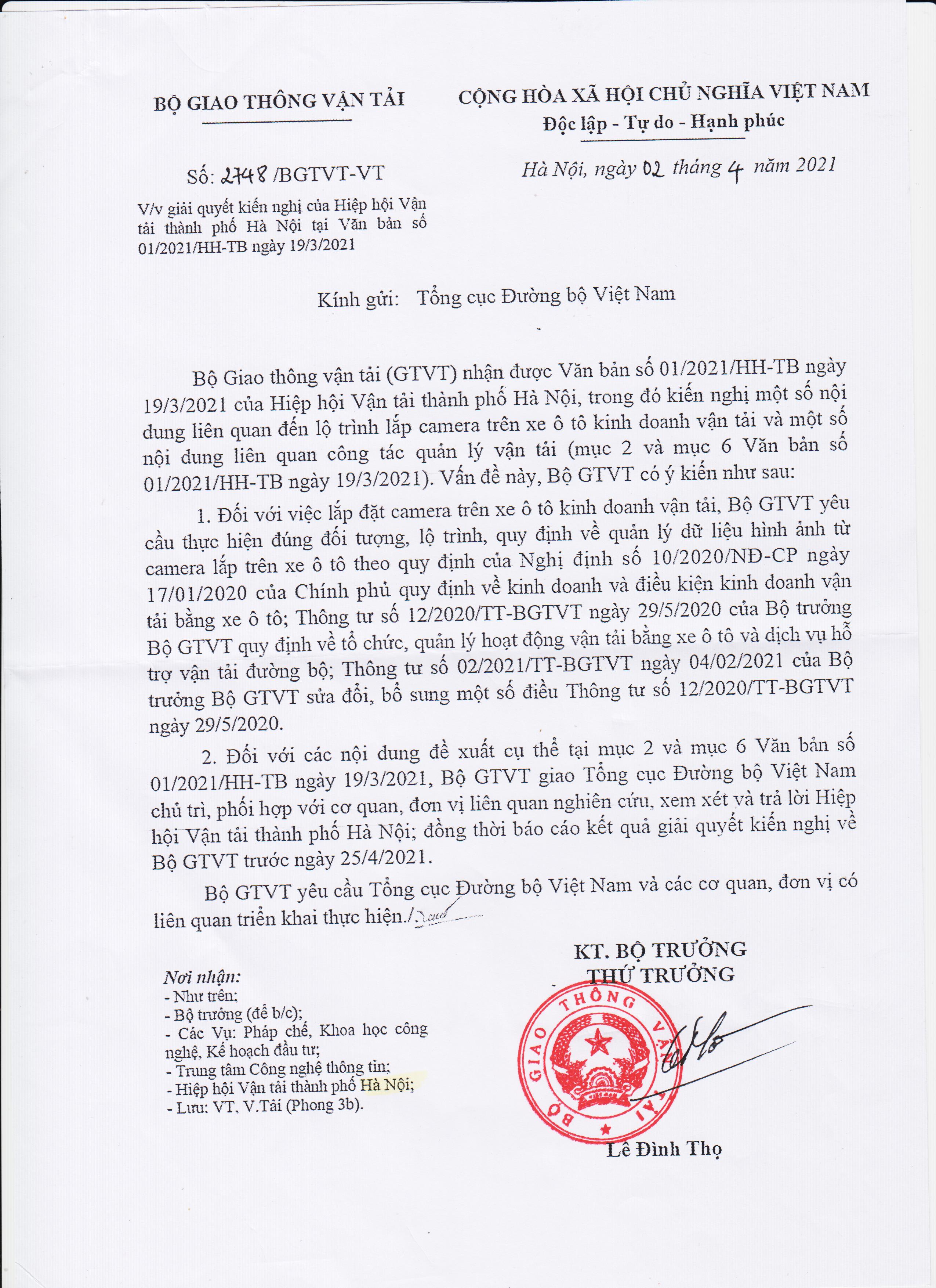 BỘ GTVT TRẢ LỜI KIẾN NGHỊ CỦA HIỆP HỘI VẬN TẢI HÀ NỘI VỀ QUẢN LÝ XE TUYẾN CỐ ĐỊNH TRÊN CÁC ĐƯỜNG CAO TỐC