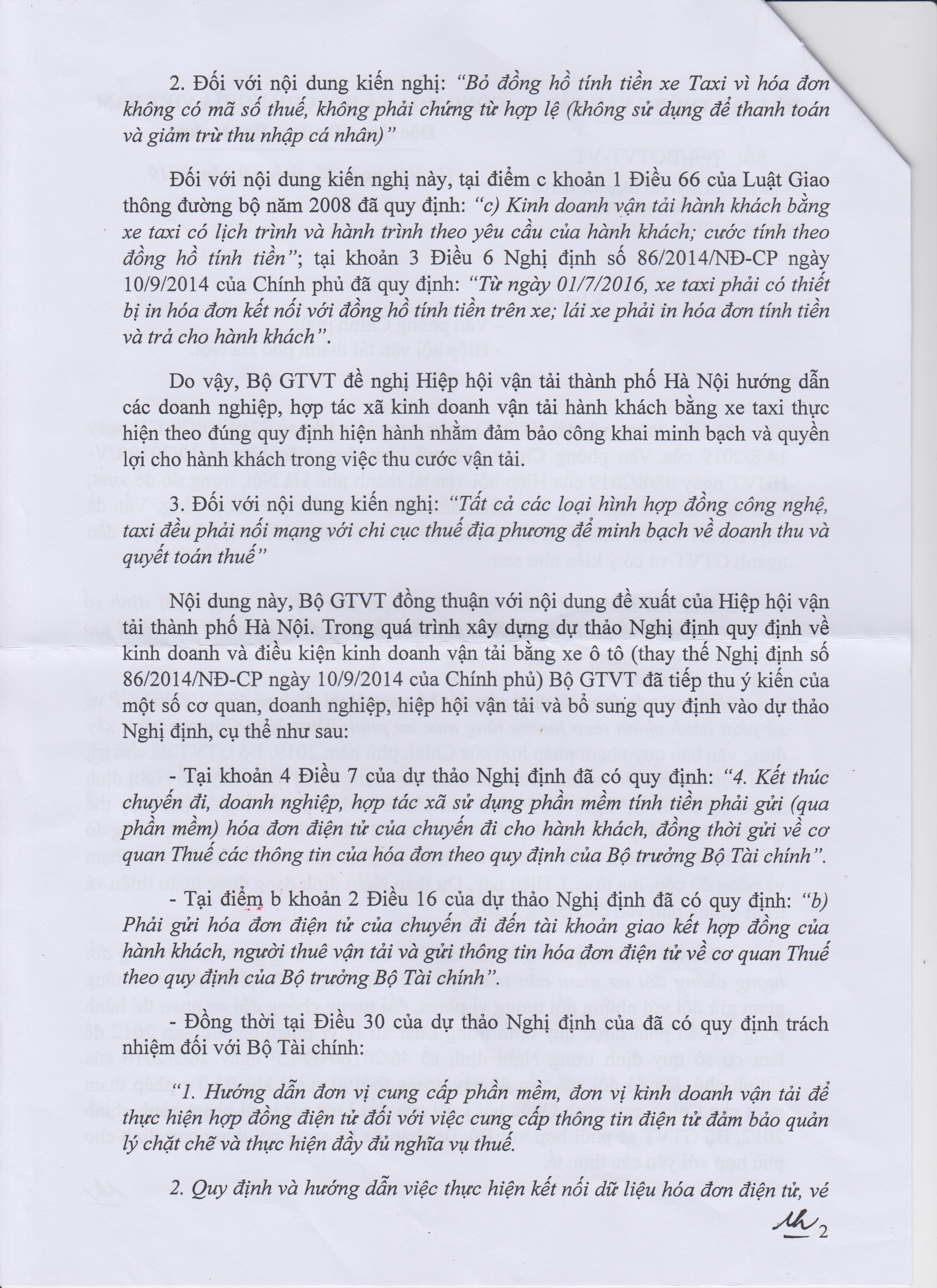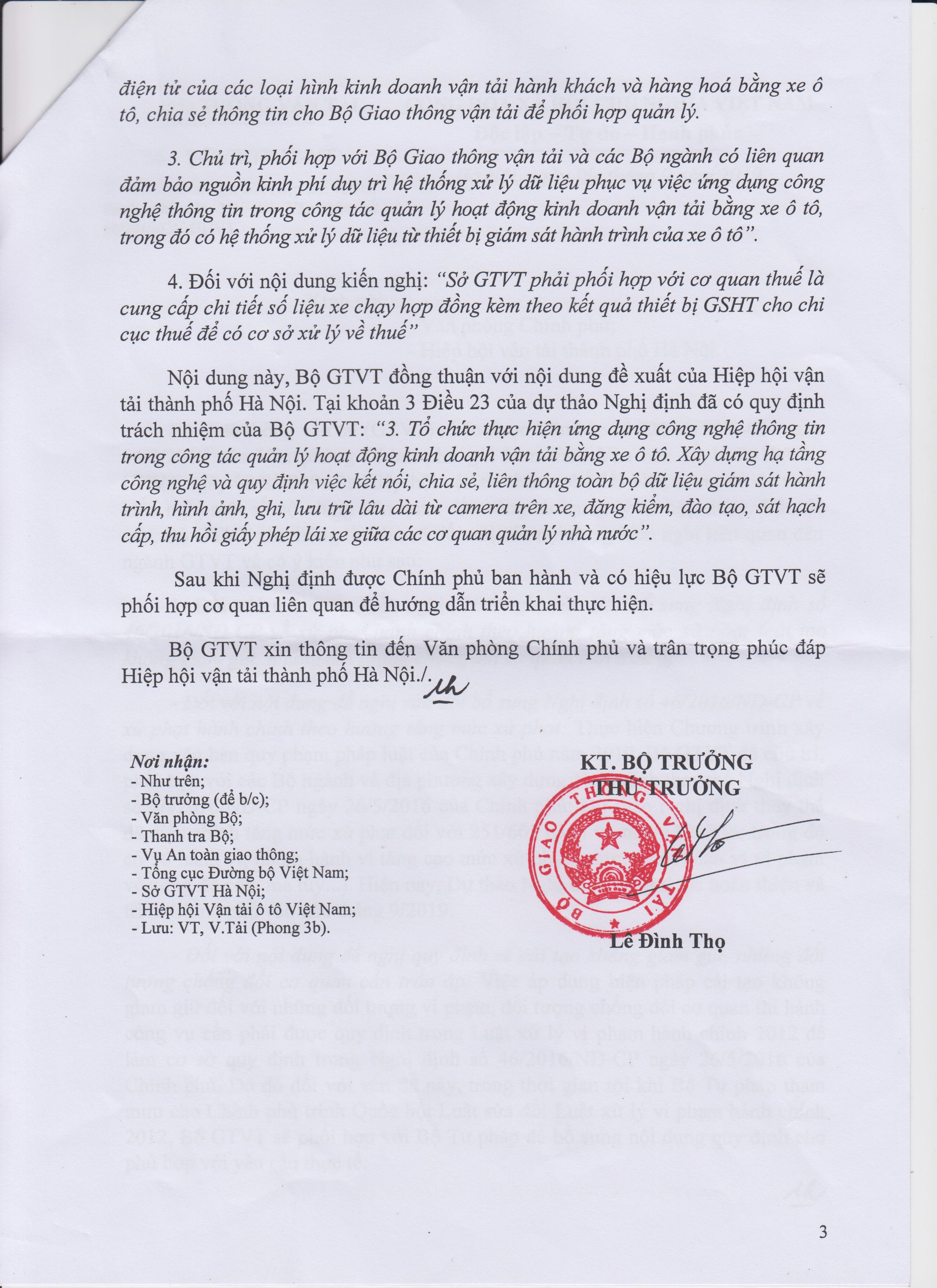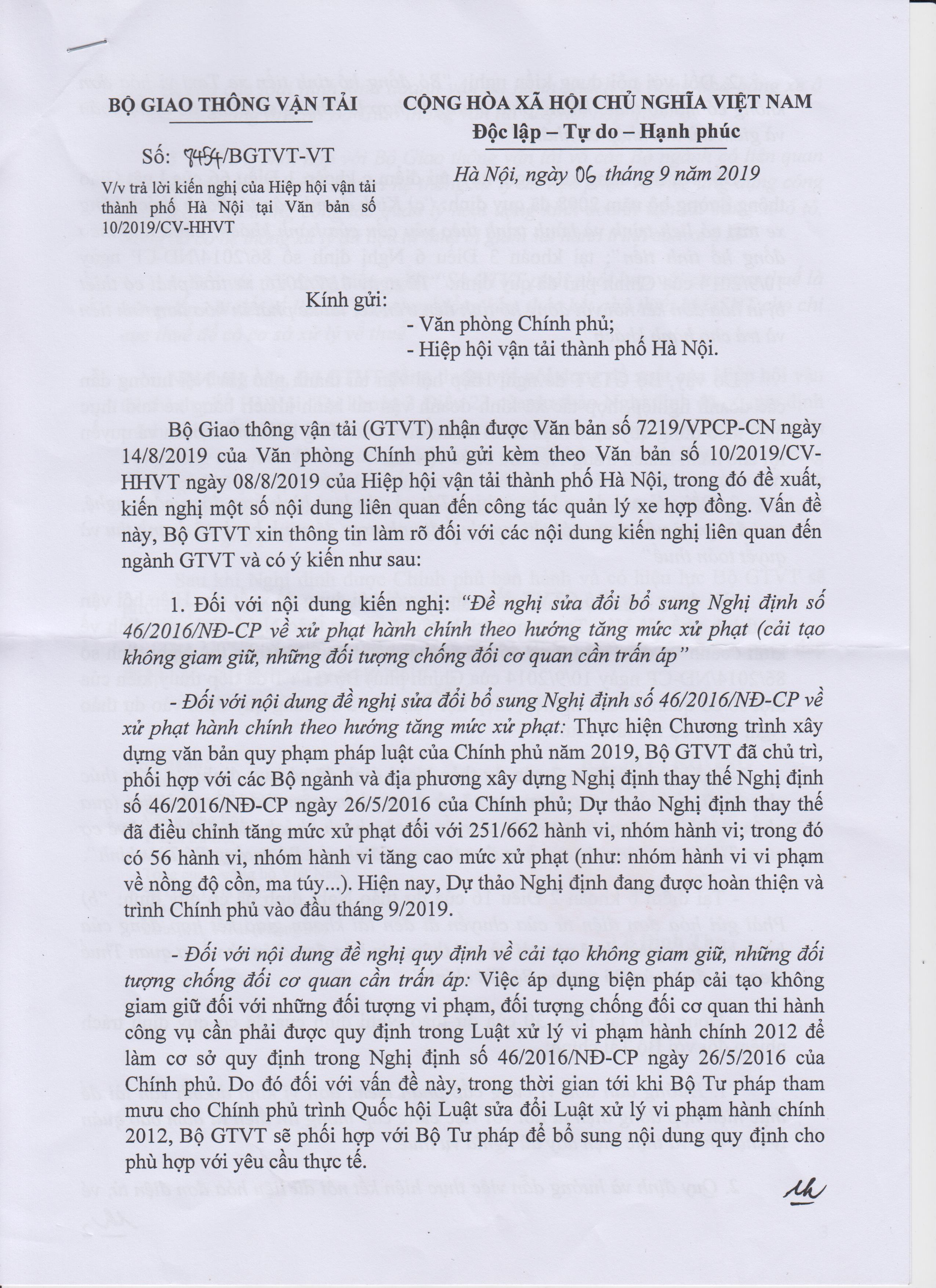 Công văn của Bộ Giao thông vận tải trả lời kiến nghị của Hiệp hội vận tải TP Hà Nội tại văn bản số 10/2019/CV-HHVT