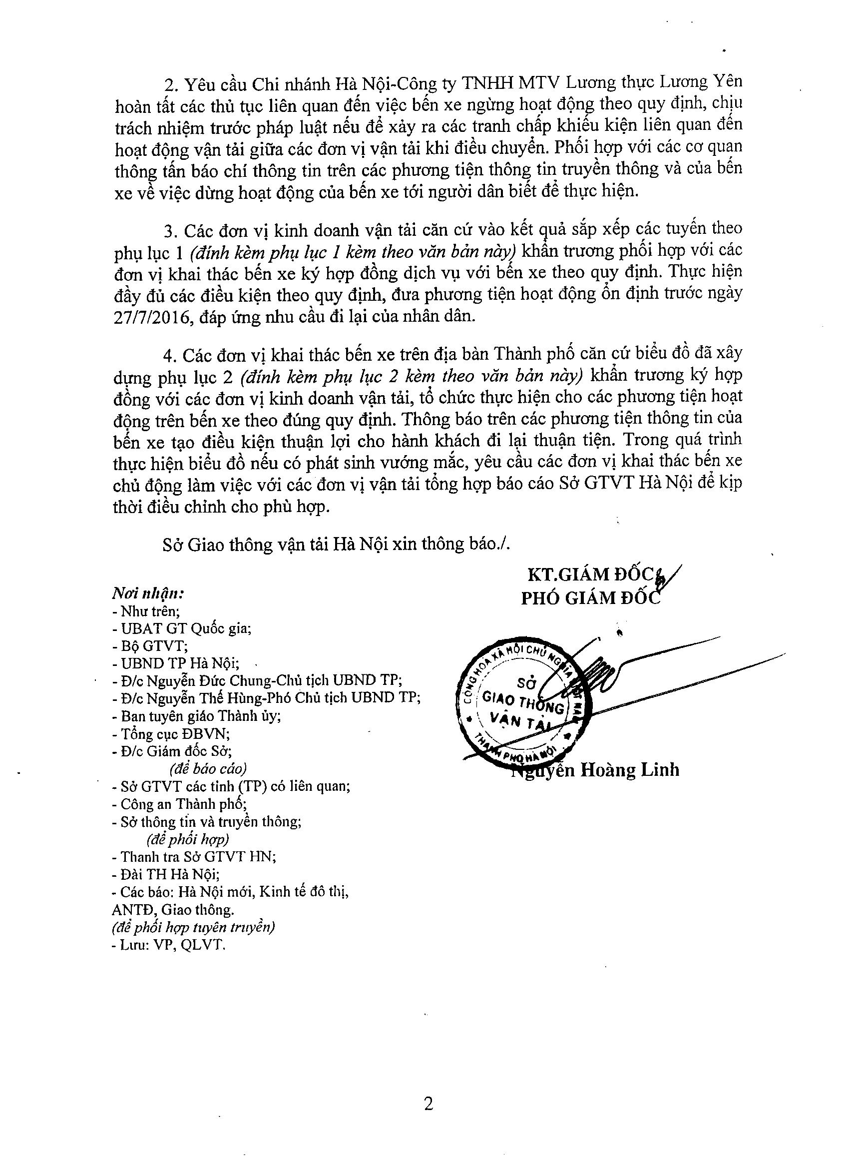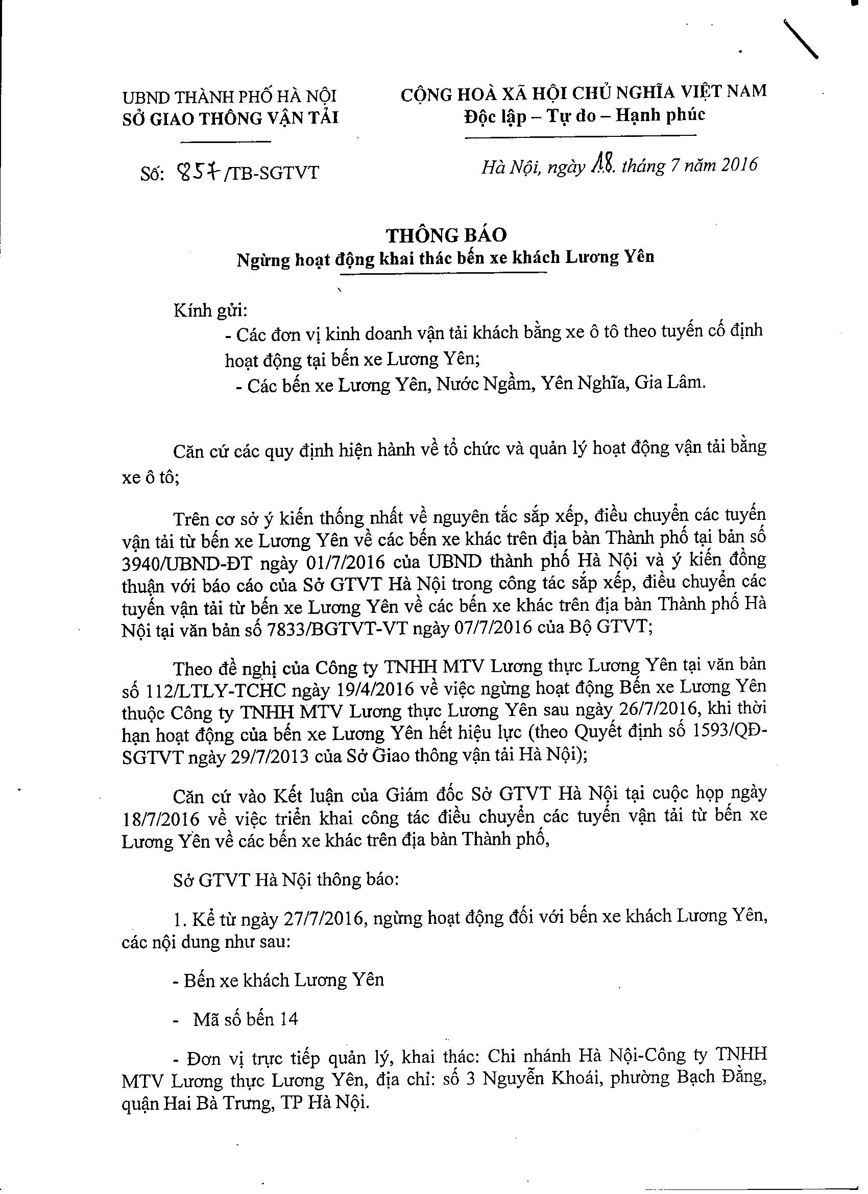 Ngày 18/7/2016, Sở GTVT có Thông báo số 857/TB-SGTVT về việc ngừng hoạt động khai thác Bến xe khách Lương Yên